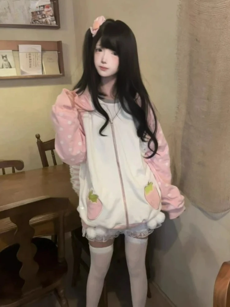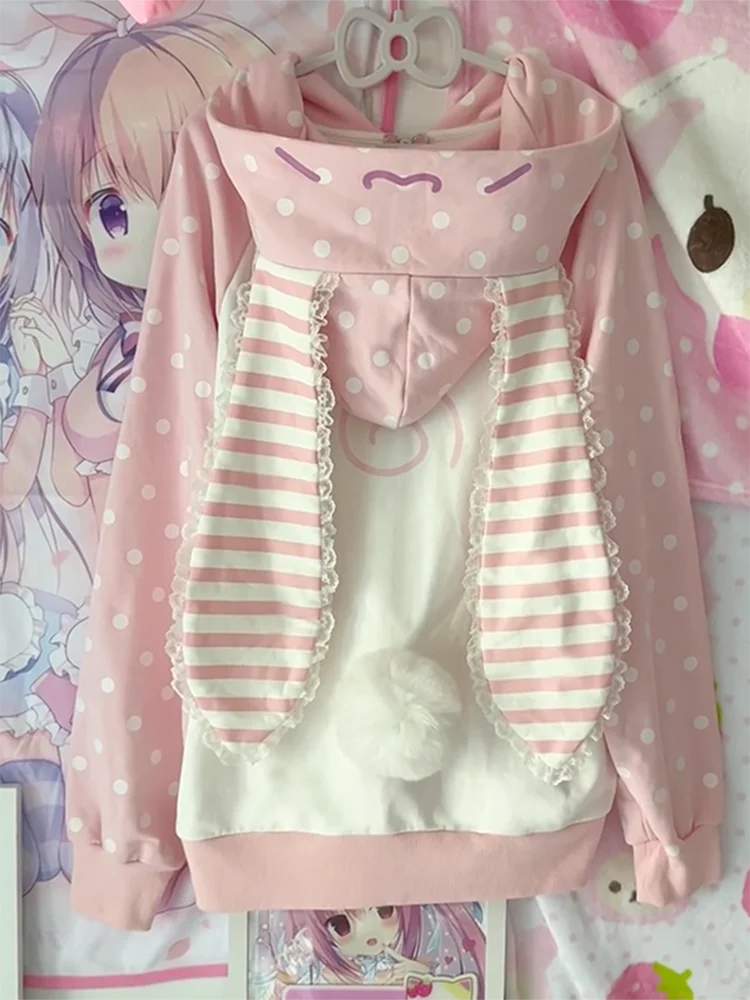 Japanese Kawaii Rabbit Ears Coat Women Sweet Pink Stripe Zipper Hooded Coats Grunge Hoody Y2k Harajuku Strawberry Sweatshirts