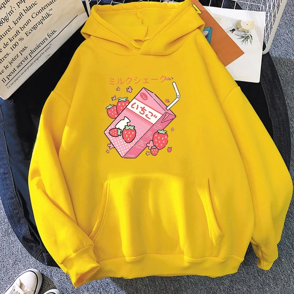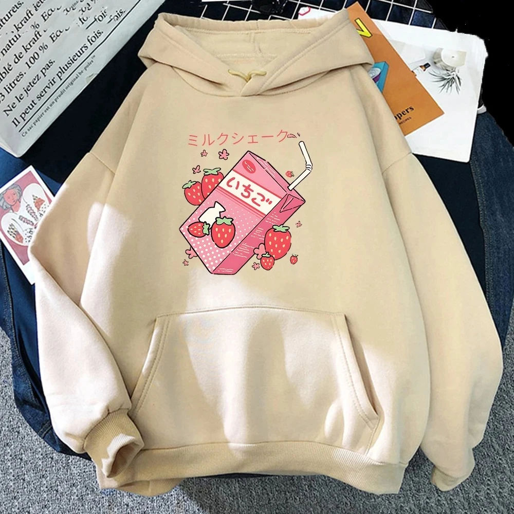 Strawberry Milk Hoodie Women Harajuku Aesthetic Clothing Autumn Winter Kawaii Graphic Hoodies Girls Cute Printed Sweatshirts