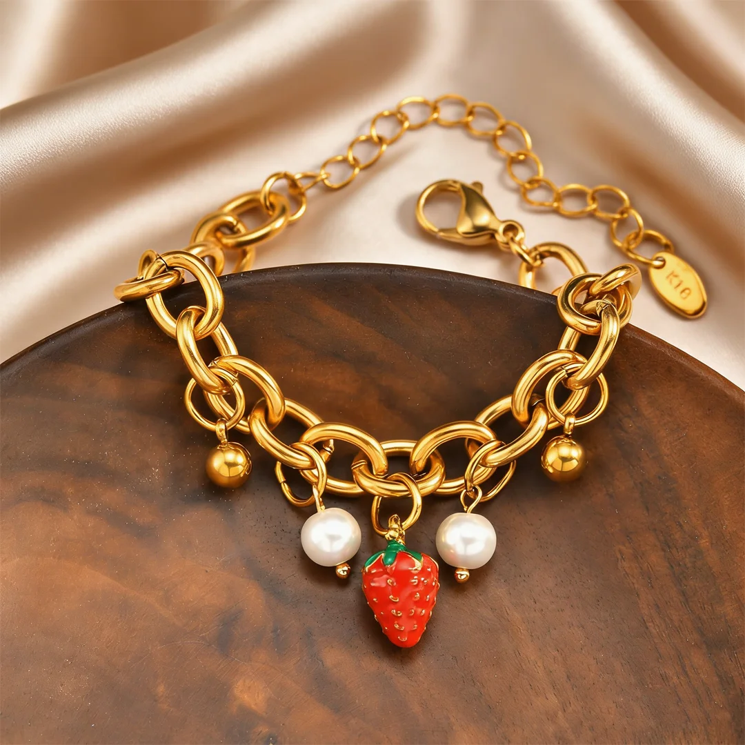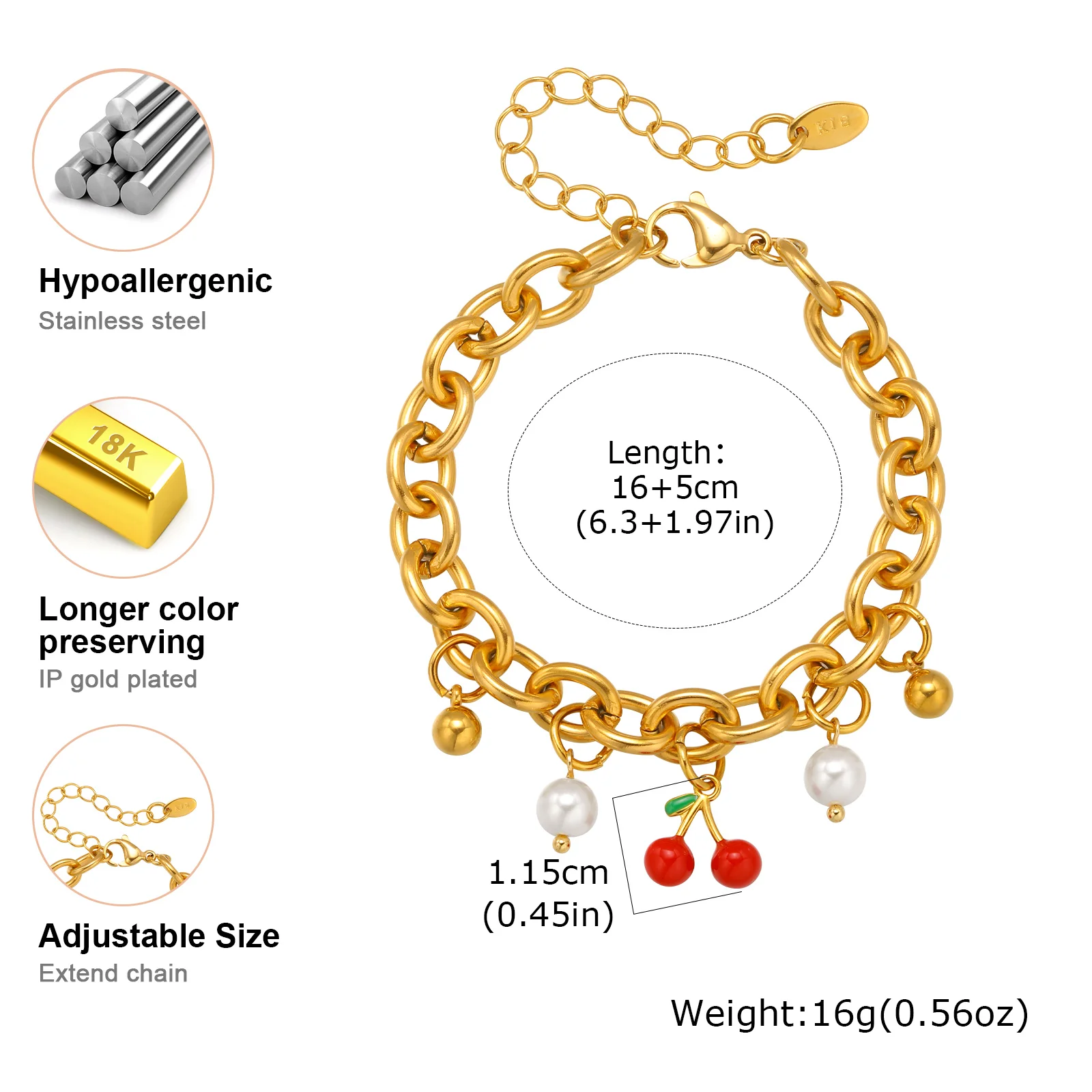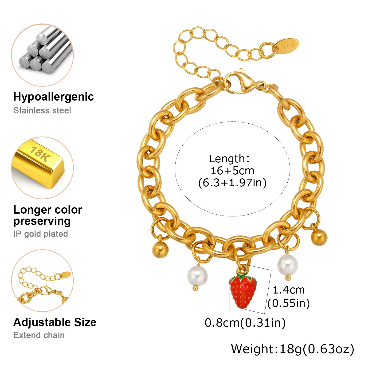 Trendy Sweet Red Cherry Strawberry Bracelet for Women, 18K Gold Plated Stainless Steel Charm Bracelet,No-fading Delicate Jewelry