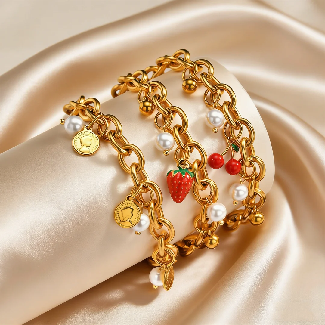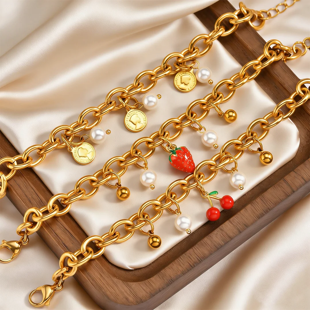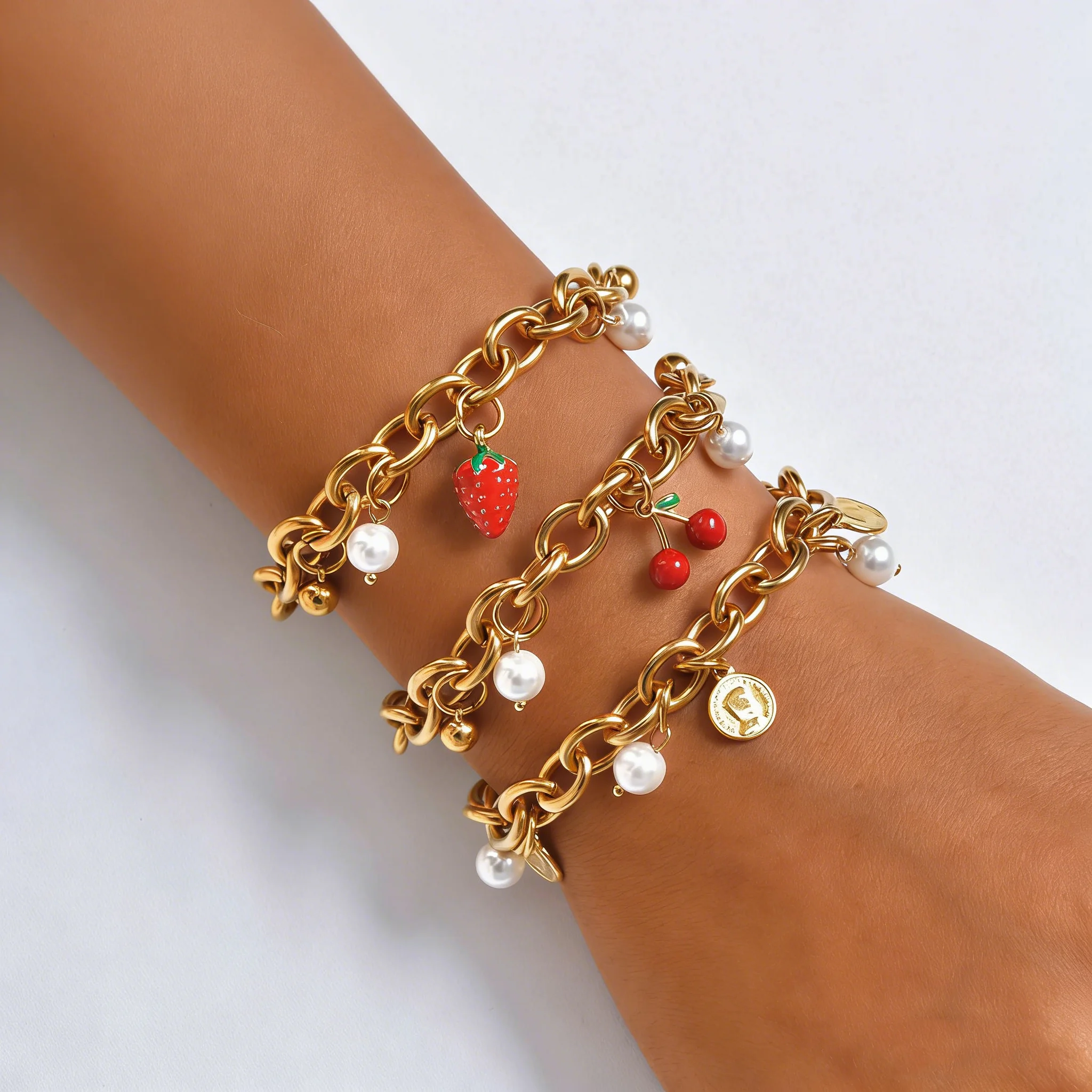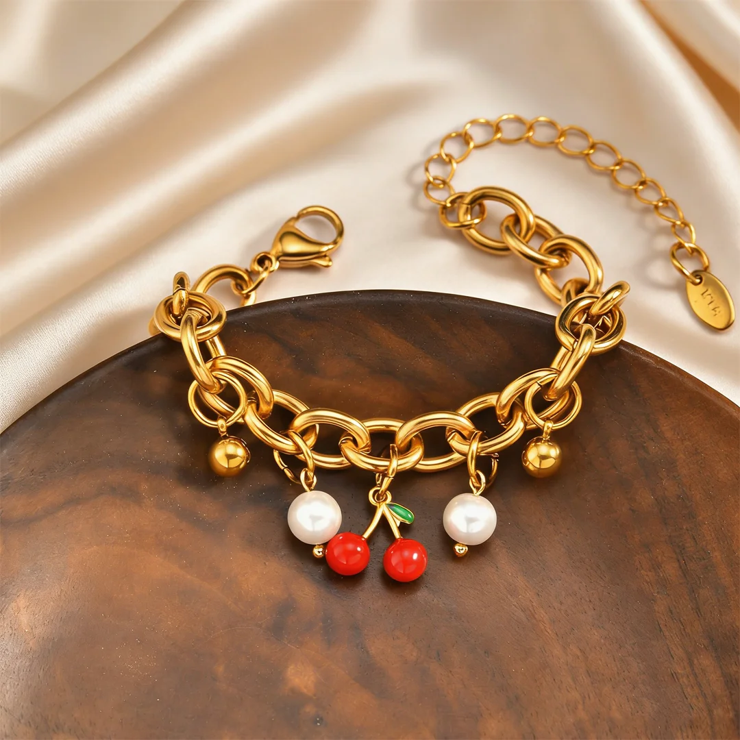 Trendy Sweet Red Cherry Strawberry Bracelet for Women, 18K Gold Plated Stainless Steel Charm Bracelet,No-fading Delicate Jewelry