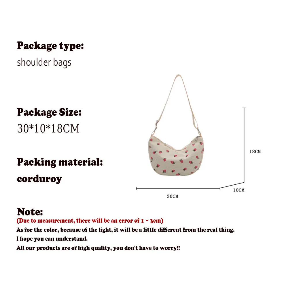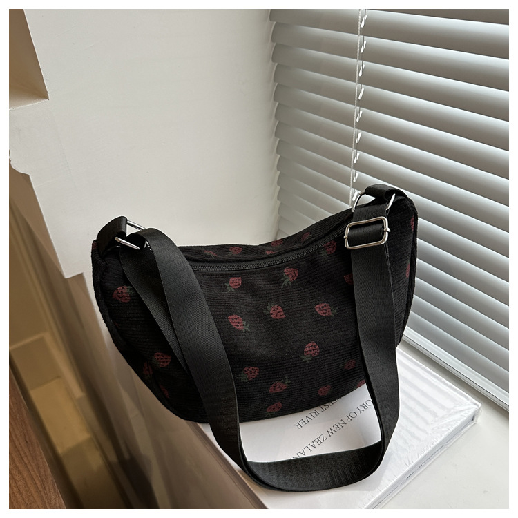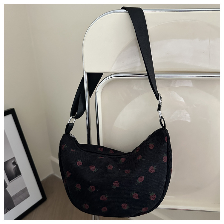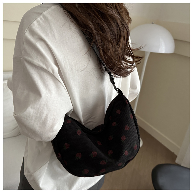 Women's Bag Corduroy Dumpling Bags Shoulder Crossbody Handbag with Ruched Strap Strawberry Pattern Large Capacity Travel Handbag